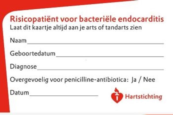 Voor mensen met een verhoogd risico op endocarditis, bijvoorbeeld vanwege een aangeboren hartafwijking, is het mogelijk om bij de Hartstichting een gratis risicokaartje aan te vragen, waardoor iemand altijd de juiste informatie op zak heeft.