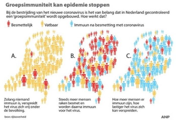 De meeste mensen die een coronabesmetting hebben opgelopen, genezen binnen twee weken, waarna, tenzij de besmetting echt maar heel minimaal is geweest, antistoffen in het bloed kunnen worden aangetoond. We weten inmiddels dat het virus niet kan worden uitgebannen zolang er geen effectief vaccin op de markt is en daarom streeft de Nederlandse overheid ernaar om, tot die tijd te proberen in Nederland groepsimmuniteit te laten ontstaan. Onder groepsimmuniteit wordt verstaan dat er zoveel mensen besmet zijn geweest dat het virus nog maar weinig nieuwe zieken kan maken. Om groepsimmuniteit te bereiken en zo op natuurlijke manier van het virus verlost te worden, moet echter minimaal 60% van de bevolking antistoffen in het lichaam hebben. Via die natuurlijke weg is dat een proces van jaren want momenteel zijn steekproefsgewijs pas bij 3% van alle Nederlanders antistoffen aangetoond. (500.000 mensen van de 17 miljoen).