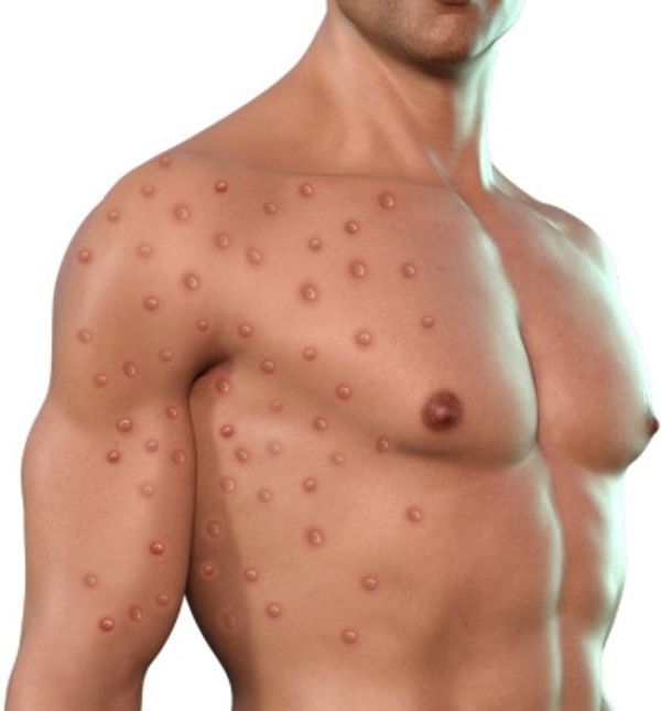Maar nu even terug naar dit moment, naar de ontdekking van besmettingen met monkeypox in Europa en in Nederland. Een besmetting met dit virus vindt waarschijnlijk plaats via huid-op-huidcontact, waarna het virus binnendringt via de slijmvliezen, zoals de mond, ogen, neus en anus of via (kleine) open wondjes. De ziekteverschijnselen beginnen een tot vijf dagen na de besmetting en bestaan uit koorts, hoofdpijn, spierpijn, gezwollen lymfeklieren, rillingen en moeheid. Een paar dagen later vertoont de huid uitslag in de vorm van platte vlekken die vervolgens overgaan in blaasjes. Deze blaasjes vullen zich eerst met helder vocht, wat later troebel wordt door pusvorming. Uiteindelijk barsten ze open en ontstaan er korstjes die indrogen en afvallen. Deze hele cyclus duurt gemiddeld drie weken.