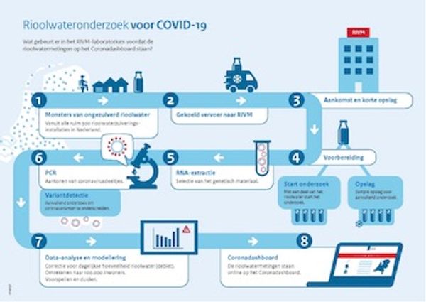 Bij de rioolwaterzuiveringsinstallaties (ruim driehonderd) worden monsters genomen van ongezuiverd rioolwater, die daarna door het RIVM worden geanalyseerd. Wekelijks worden deze cijfers vervolgens gepubliceerd, via het coronadashboard. De resultaten hiervan zijn alleen niet te vertalen naar het aantal besmette personen, omdat niet bekend is hoeveel virusdeeltjes iemand gemiddeld uitscheidt en omdat niet iedereen die besmet is, virusdeeltjes in de ontlasting heeft.