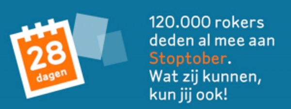 Omdat blijkbaar dus gezamenlijk stoppen met roken positieve kracht geeft, hebben KWF Kankerbestrijding, de Hartstichting, het Longfonds, het Ministerie van WVS, het Trimbos-Instituut en de GGD GHOR Nederland het initiatief genomen om één maand per jaar met een campagne van 28 dagen, op te roepen tot een samen niet roken. Dit onder de naam Stoptober. Deze campagne wordt sinds 2014 gehouden en is dus dit jaar al toe aan haar eerste lustrum. Inmiddels zijn al zo’n 120.000 mensen, door het meedoen met Stoptober definitief met roken gestopt.